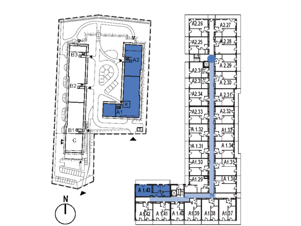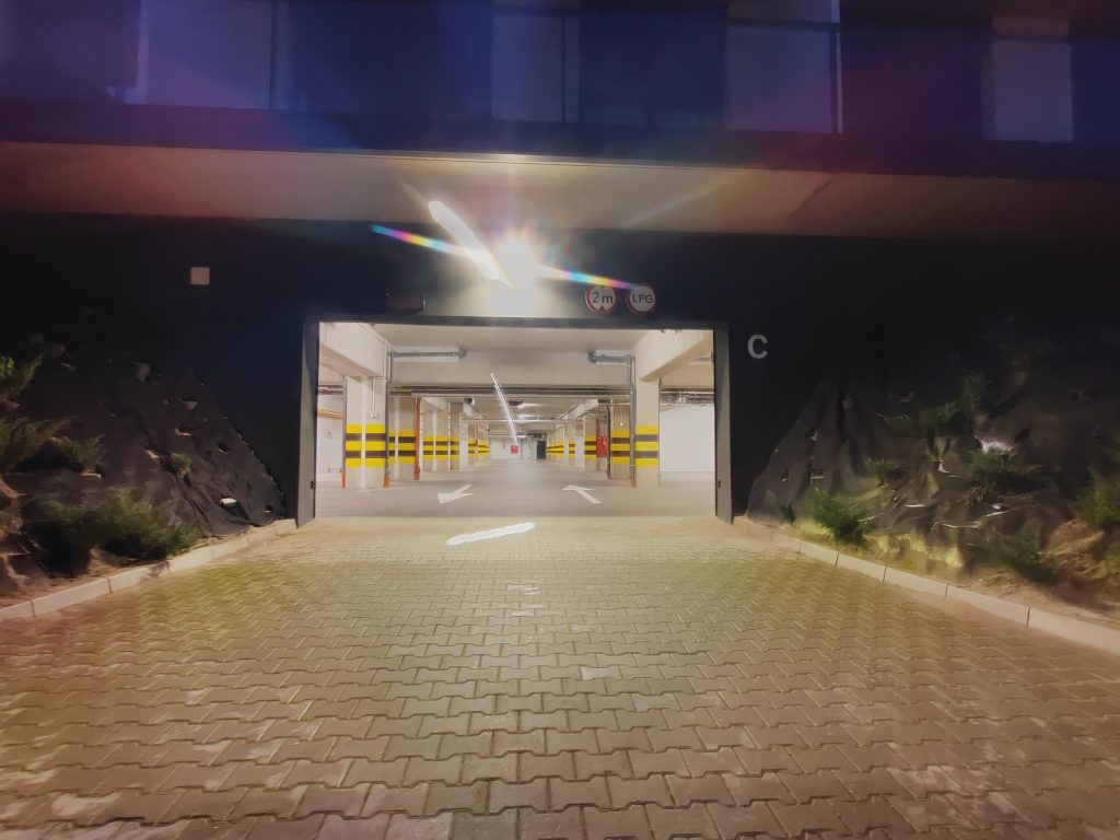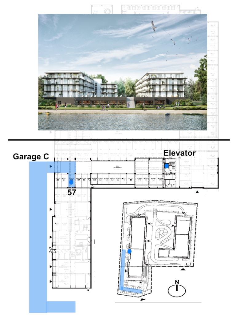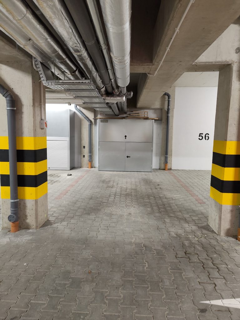Die Einfahrt zur Garage befindet sich auf Seite wo der Parkplatz ist. Hier nur noch eine Schranke passieren und in der Garage C auf dem Parkplatz 57 – es ist der dritte Parkplatz auf der rechten Seite mit einem Metallschrank – parken.