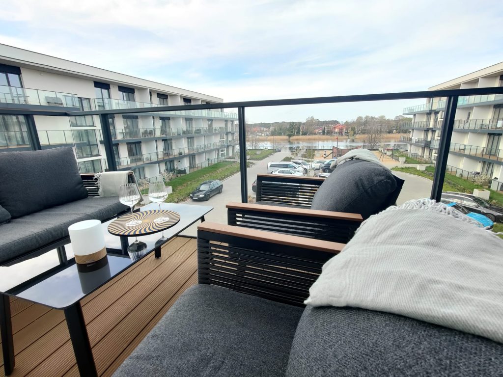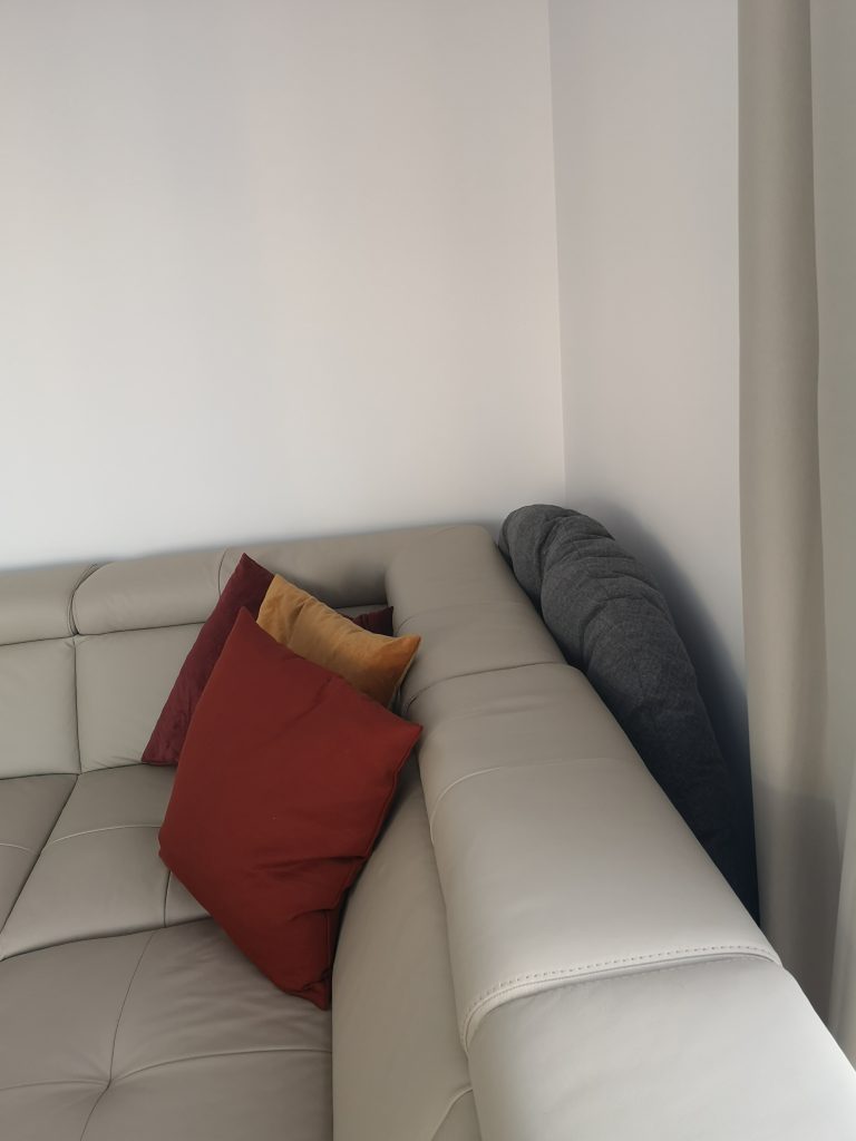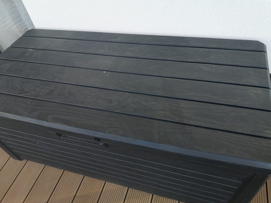 Die Auflagen für die Loungemöbel findest Du in der großen Box auf dem Balkon. Das große Kissen für den Hängesessel findet sich hinter dem Ecksofa.