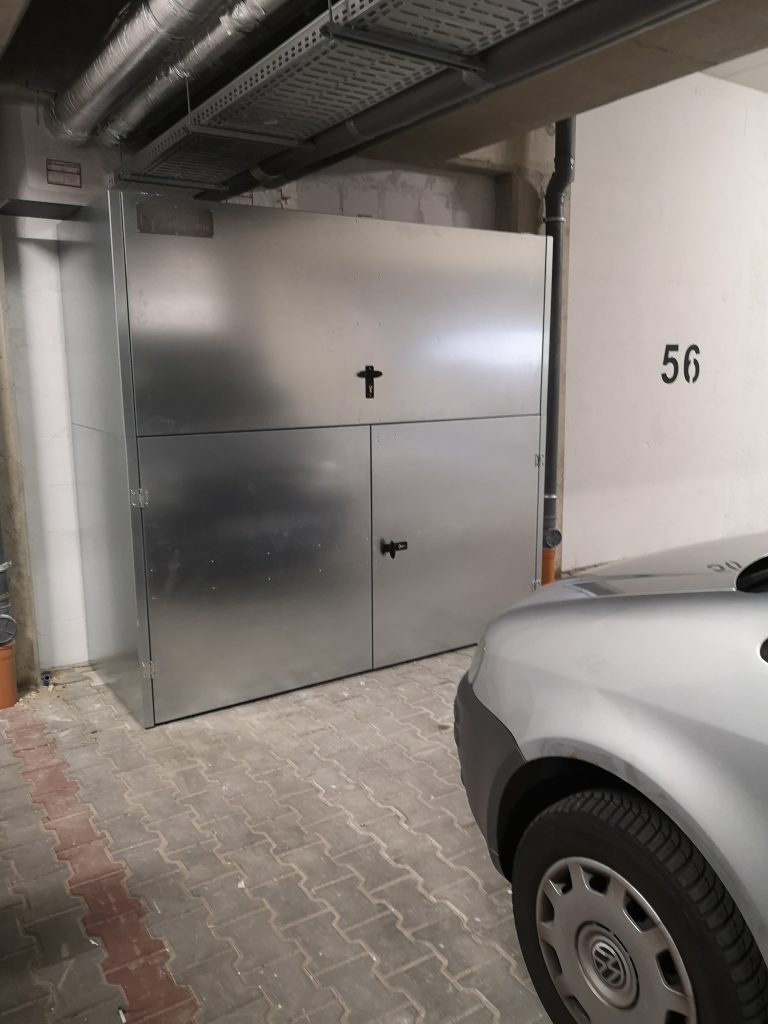 Die Garage befindet sich im hinteren Bereich des Gebäudes. Die Garagen-Einfahrt ist mit einem „C“ gekennzeichnet. Der Stellplatz ist der dritte auf der rechten Seite. Genau zwischen zwei Pfosten. Im hinteren Teil des Stellplatzes bedindet sich ein Schrank.